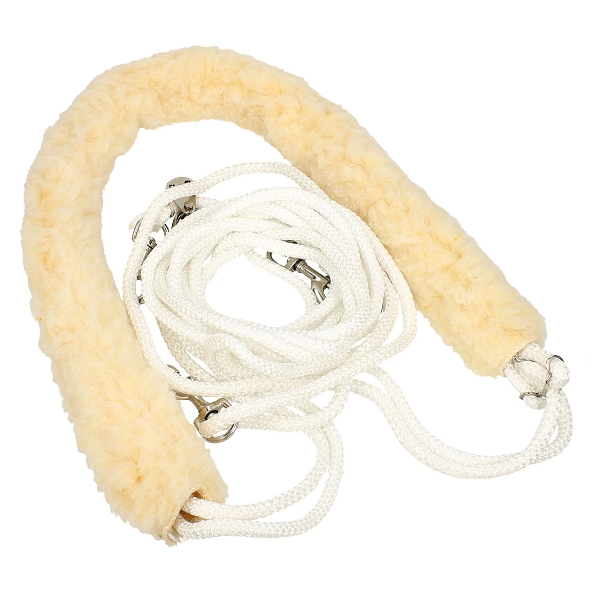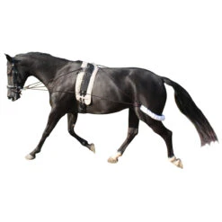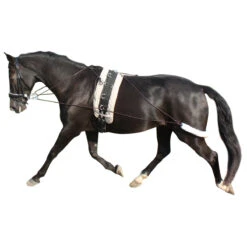 - de teugel loopt via het bit en de longeersingel achter de achterhand van het paard langs