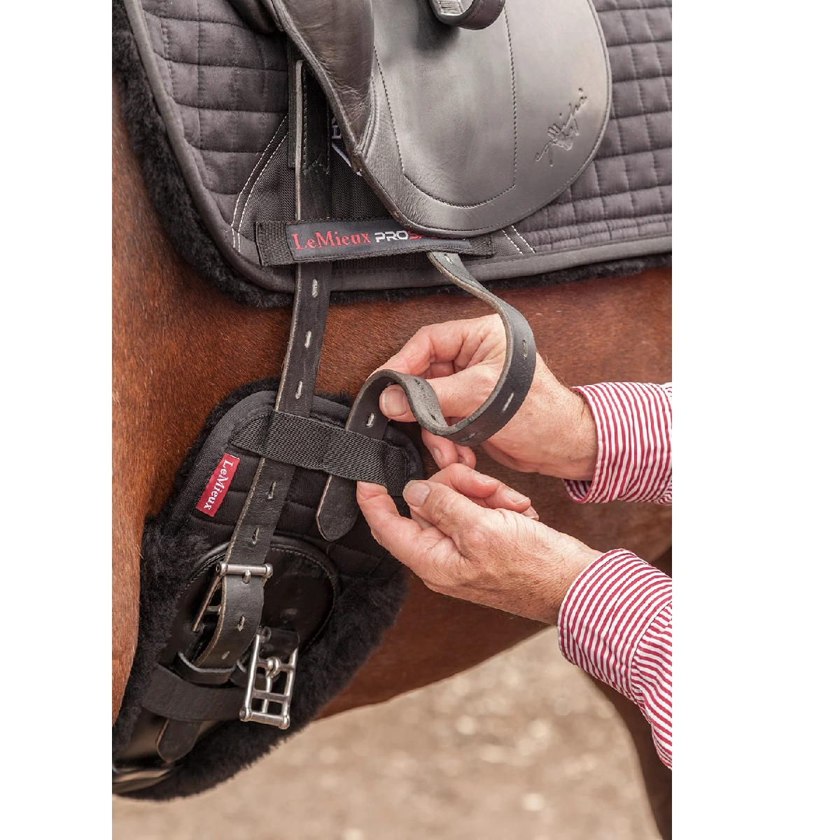 Bevestiging: Het op de juiste manier vastmaken van de twee middelste klittenbandstroken is essentieel voor een stevige bevestiging aan de singel. Doe de onderste klittenbandstrook over de singel en stop het uiteinde onder de singel. Trek dan de bovenste klittenstrook stevig aan en bevestig deze. Zo heb je een optimale grip. Zorg bij het bevestigen van de onderlegger dat de bovenste klittenbanduiteinden naar de achterzijde van het paard wijzen.