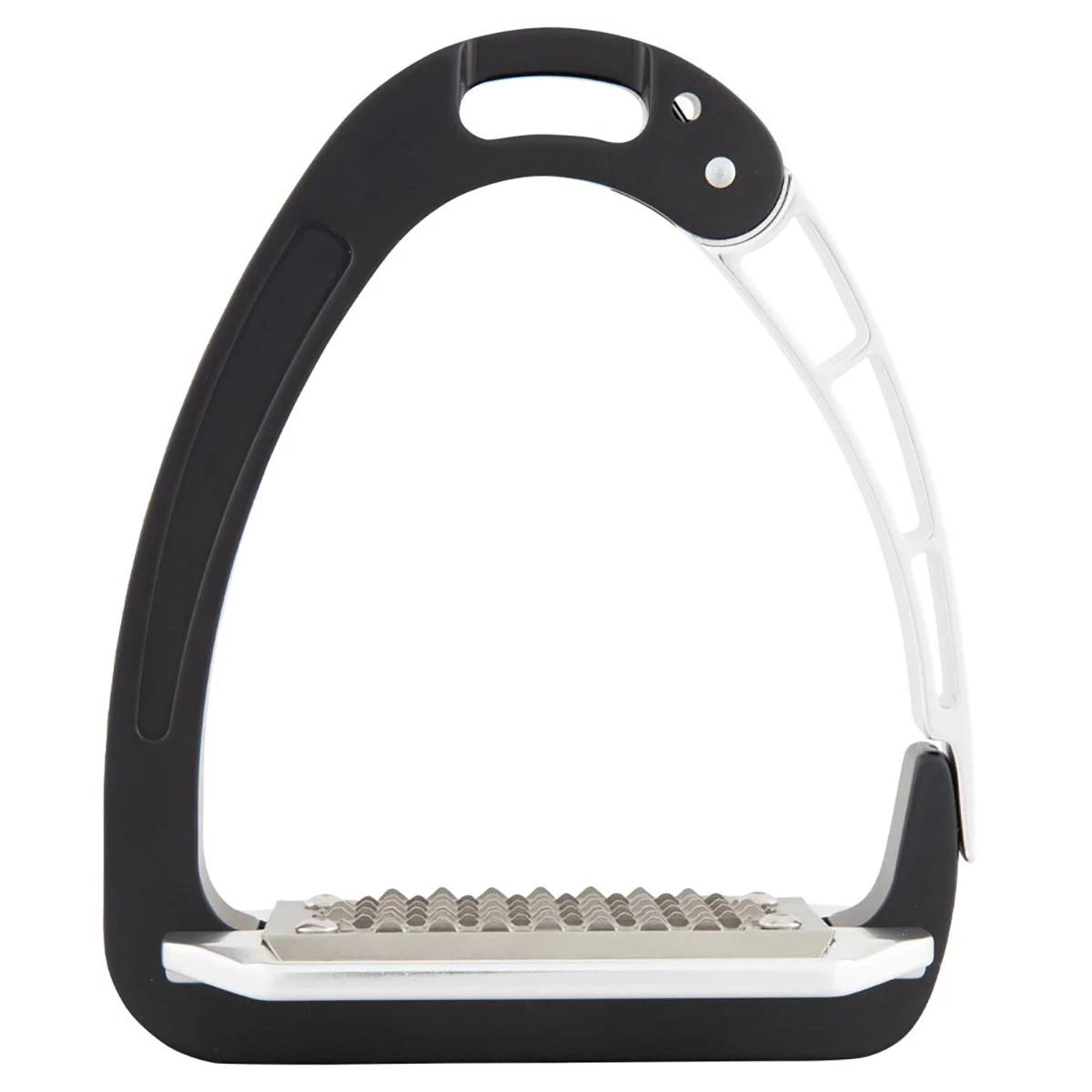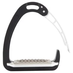 - het gewicht van de ruiter zorgt ervoor dat de beugel opent bij een val, zo blijft de voet niet in de beugel hangen